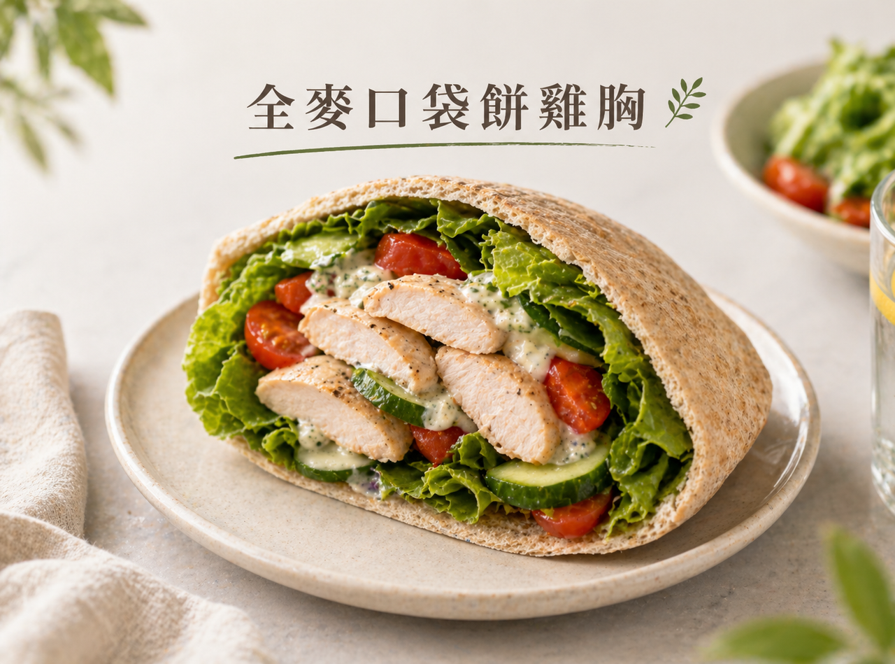 把口袋餅切開後,塞入雞胸、生菜、小黃瓜與番茄,再加一點優格醬或胡麻醬,就是一份完整度很高的輕晚餐。